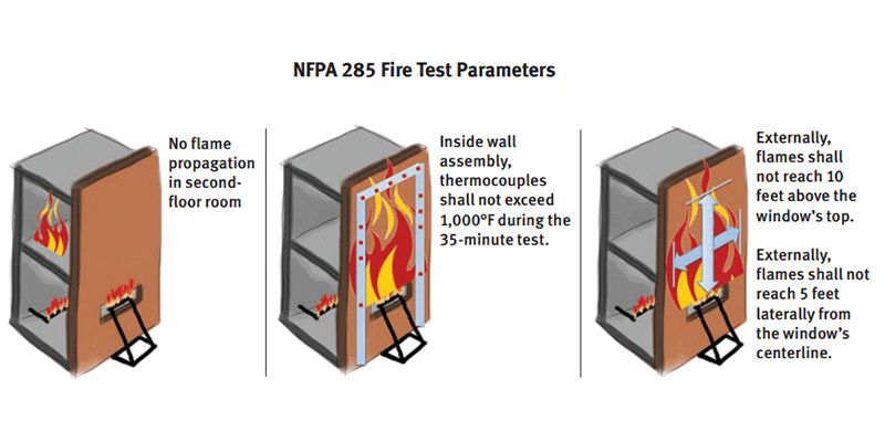 Market demand for insulations, dedicated air and waterresistive barriers, and other combustible envelope materials are at an all-time high due to new building performance, facility life, and occupant health and safety requirements. Consequently, the code-required fire test standard called National Fire Protection Association (NFPA) 285 has become a subject of focus as its relevance has significantly increased with recent International Building Code (IBC) updates and the use of more combustible components in advanced wall systems.