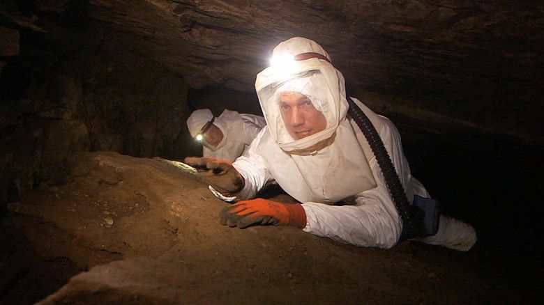 The team now crawls through a narrow gap to reach a difference chamber, where different species of bats with other potential pathogens live. Each bat has the potential to carry rabies, Marburg, even Ebola. These are some of the planet's deadliest, but least understood, viruses.